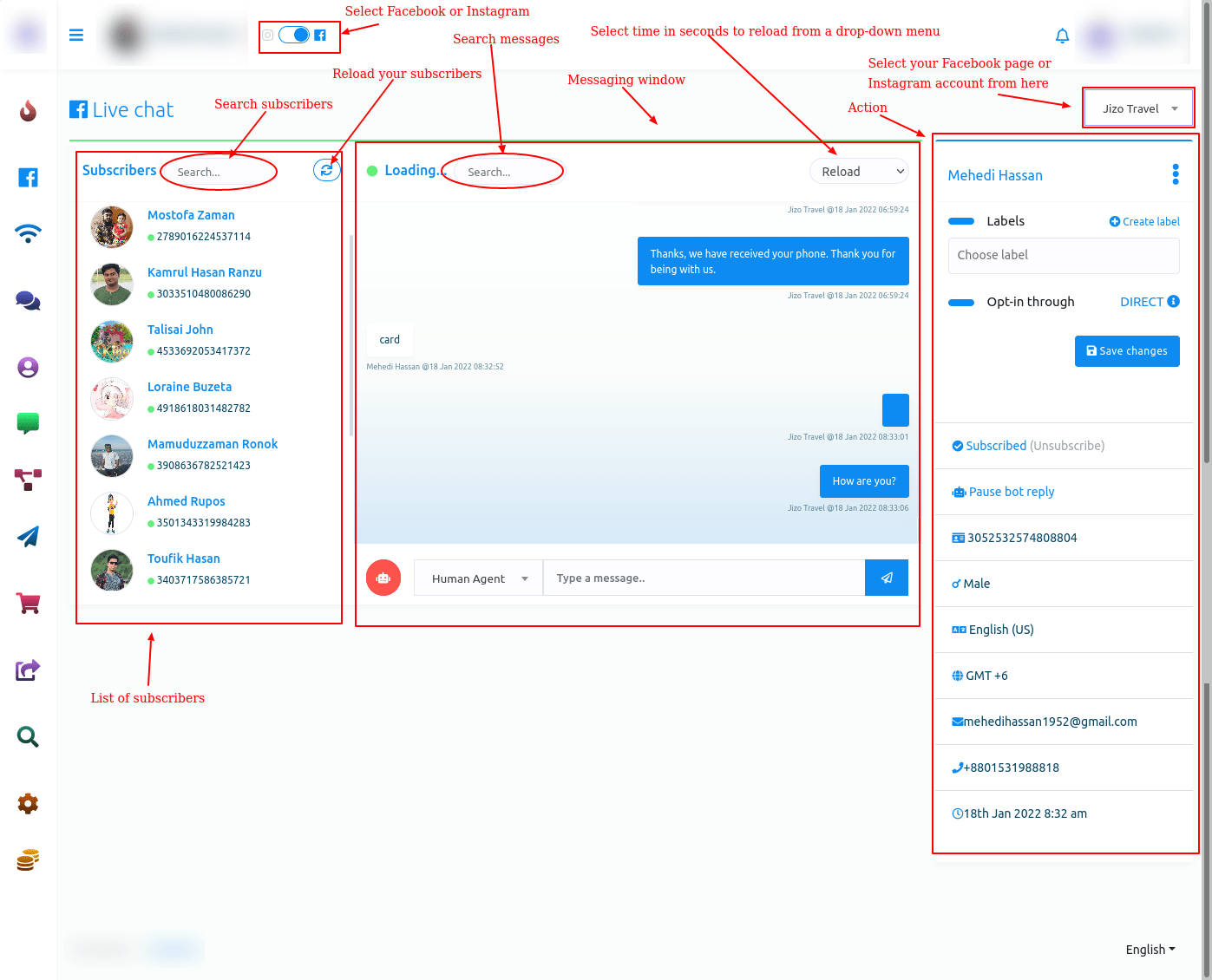 In the subscribers’ list section, you can see the list of subscribers who you have conversed with recently. Also, you can search for a subscriber on the search bar. And by clicking on the reload button, you can reload the Live Chat, though the live chat reloads automatically at times.