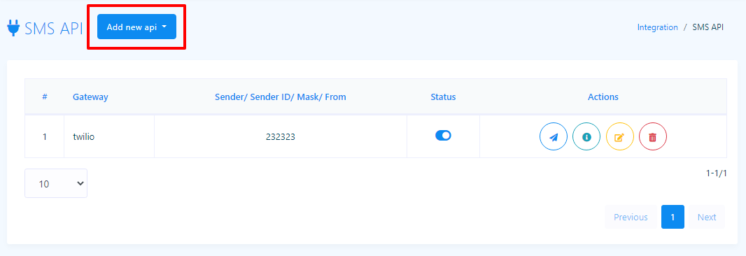 Twilio is one of the most popular SMS Gateway in worldwide. Chatpion has integrated Twilio by using their API. You can easily use twilio service through chatpion system for SMS broadcasting. Click on the Twilio and you'll redirect to the SMS API management section. click on Add new API -> Add default Gateway, a modal will appear and select twilio from the API list.